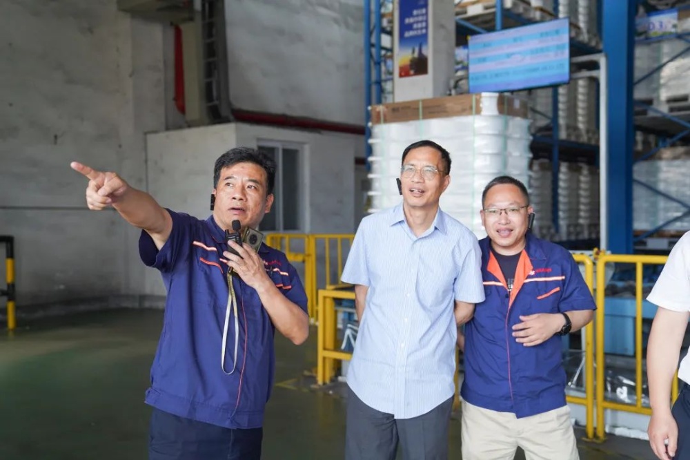 谢主任一行在沈总的陪同下,,,,,,深入生产一线考察“聚酯长丝未来工厂”建设情形,,,,,,辖档退解卷绕、包装、立体客栈等运行情形。。。。。。