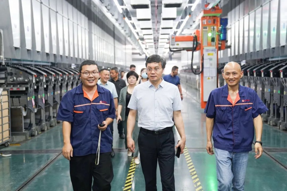 在“聚酯长丝未来工厂”,,,,,,,,胡主任一行详细相识了公司信息化生产流程、工艺特点、制造装备等情形。。。。。。对企业5G智能化、自动化生产等给予了高度评价。。。。。。