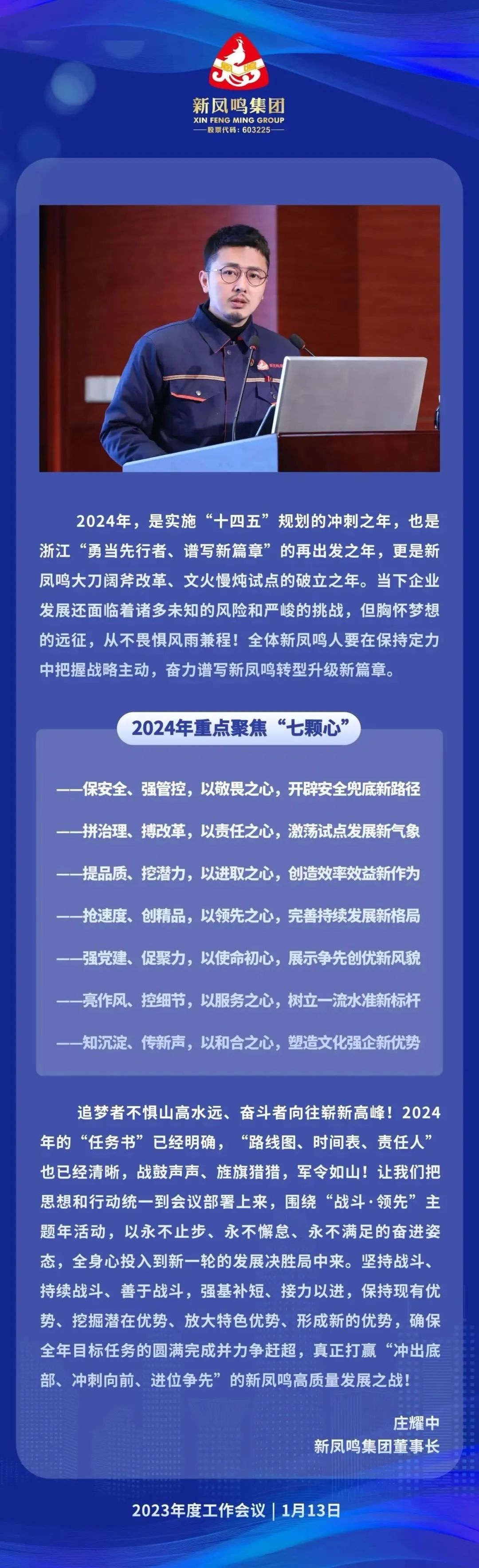 1月13日,,,,,,,,摩登4-梦想照进现实,努力成就未来!集团2023年度事情聚会在总部报告厅顺遂召开。。。。。。集团董事长庄耀中、控股集团董事长庄奎龙等向导出席聚会。。。。。。公司科助级及以上职员共700余人加入,,,,,,,,湖州、平湖、徐州基地以寓目直播形式加入,,,,,,,,聚会由控股集团董事长庄奎龙主持;;;;;;集团董事长庄耀中作2023年度事情报告;;;;;;执行总裁沈健彧作一号文件宣读,,,,,,,,下达2024年使命妄想;;;;;;副总裁许纪忠作二号文件宣读,,,,,,,,就主题年运动举行安排;;;;;;副总裁管永银作三号文件宣读,,,,,,,,就湖州基地化审核举行安排;;;;;;中高层举行亮相讲话;;;;;;董事长庄耀中划分与各基地认真人、安环总监签署2024年清静责任状。。。。。。