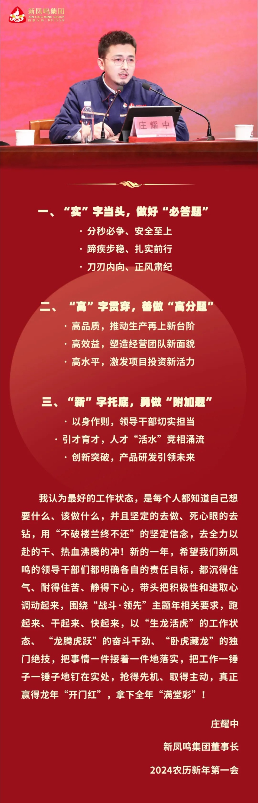 集团董事长庄耀中在会上鼓舞全体向导干部们要以“赶考”的姿态奋力冲刺开门红,,,,,,全力以赴答好2024这张考卷的“首题”,,,,,,竭尽所能交出2024整年“满分答卷”!并提出三点意见。。。。。