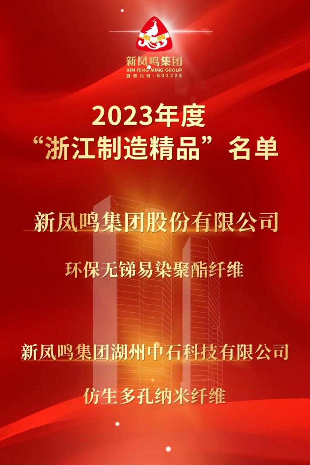 喜事连连,,,,,2023年度“浙江制造精品”名单于克日宣布。。 。。。摩登4-梦想照进现实,努力成就未来!集团环保无锑易染聚酯纤维、中石科技仿生多孔纳米纤维双双上榜。。 。。。