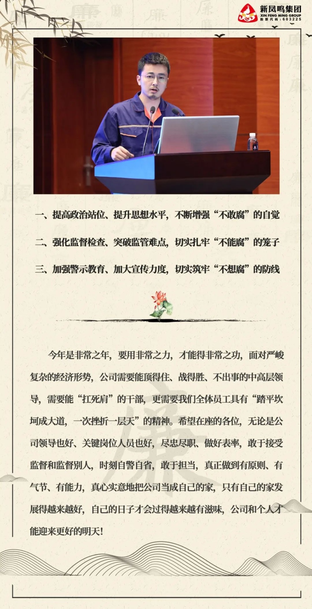 山先生以《清廉诚信从业 合规创立价值》为主题,,,,,,,以现实案例为抓手,,,,,,,从常见民企内部职务犯法、诱发民企内部职务犯法主要缘故原由、民营企业常见的其他犯法类型、预防犯法的对策和建议四方面,,,,,,,为各人带来了一堂生动精彩课程,,,,,,,敲响在场员工清廉自律警钟,,,,,,,助推公司清廉建设。。。。。