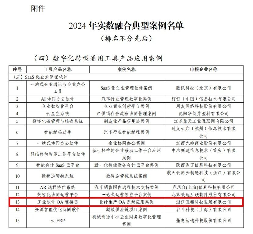 克日,,,,,,,工业和信息化部信息手艺生长司公示了《2024年实体经济和数字经济深度融合典范案例名单》,,,,,,,“五疆生长”公司“工业软件OA毗连器”产品在“SaaS化企业治理软件”领域脱颖而出,,,,,,,入选“数字化转型通用工具产品”种别天下十五大案例之一。。。。。。。。