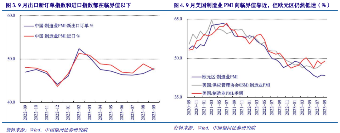 9月制造业新订单指数、生产指数都有进一步加速,,, , ,, ,,供需同时扩张。。。。。。。。9月生产指数升至52.7%(前值51.9%),,, , ,, ,,新订单恢复至50.5%(前值50.2%),,, , ,, ,,供应与需求同步恢复。。。。。。。。但新出口订单指数和入口指数小幅回升但仍在临界值以下,,, , ,, ,,划分为47.8%和47.6%(前值46.7%和48.9%),,, , ,, ,,出口预期有一定修复,,, , ,, ,,但入口预期回落。。。。。。。。展望下一阶段,,, , ,, ,,目今美国制造业PMI已经最先企稳并向临界值回归,,, , ,, ,,未来美联储完全阻止加息(预计2023Q4)之后,,, , ,, ,,可能对中国出口会有进一步增进作用。。。。。。。。