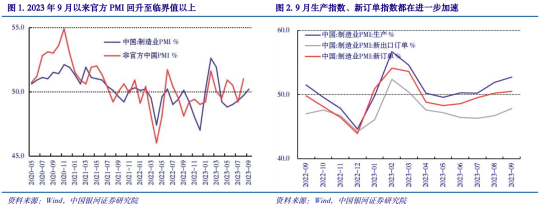 剖析:9月制造业PMI终于回归光临界值以上,,, , ,, ,,其中生产指数和新订单指数都进一步扩张,,, , ,, ,,出厂价和购进价也都在继续上行,,, , ,, ,,但新出口订单与入口指数、库存指数、中小企业与从业职员指数仍然在缩短。。。。。。。。效劳业PMI竣事了3月以来一连下行的趋势,,, , ,, ,,但效劳业新订单指数还在进一步缩短。。。。。。。。修建业PMI加速,,, , ,, ,,其中修建业新订单指数回升至50.0%。。。。。。。。总之,,, , ,, ,,经济已最先修复但斜率仍相对缺乏,,, , ,, ,,2023Q4起点优异,,, , ,, ,,下一阶段应应期待政策组合的进一步效果和美联储最终阻止加息之后的出口见底。。。。。。。。