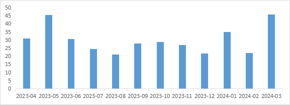 2024年一季度我国PTA出口总量为102.71万吨,,,,,同比增添12%。。。。。。其中3月PTA出口45.7万吨,,,,,创单月出口历史新高,,,,,同比增添11.3%,,,,,环比增添107.7%。。。。。。其中土耳其、越南、埃及、阿曼、俄罗斯为出口商业同伴前五。。。。。。自去年下半年最先,,,,,受BIS政策的影响,,,,,出口至印度的PTA数目最先镌汰,,,,,今年第一季度出口至印度PTA为5.2万吨,,,,,占总量的5.1%,,,,,约1.7万吨/月,,,,,较去年下降了68.5%。。。。。。今年土耳其今年新增一套30万吨聚酯产能,,,,,其需求量增添,,,,,土耳其已经成为中国大陆PTA出口第一大目的地。。。。。。3月出口增幅显着也有由于春节因素,,,,,1-2月集港的PTA在3月报关出口。。。。。。
